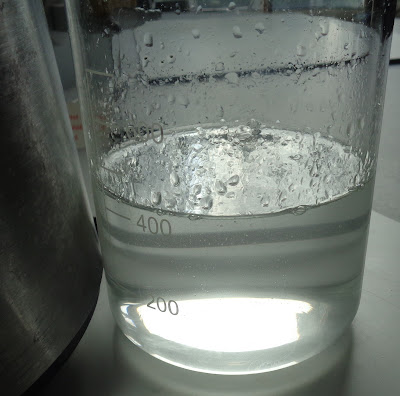 Tijdens het destilleren was de geur van gember duidelijk waarneembaar ook in de gang grenzend aan het binaslab waar de leerlingen bezig waren! Het destillaat (etherische olie en hydrolaat) heb ik de leerlingen laten opvangen in een groot bekerglas.