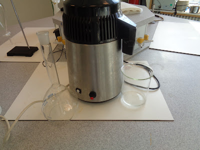 Voor de destillatie heb ik de leerlingen laten werken met een glazen destilleeropstelling. In deze glazen destilleeropstelling zit een zogenaamde tussenbol met een capaciteit van 2 Liter. Ruim voldoende om de 500 gram ( 519,09 exact) gedroogde gember in te doen.