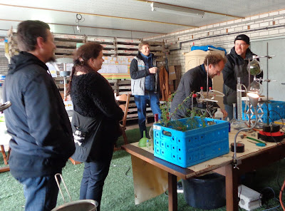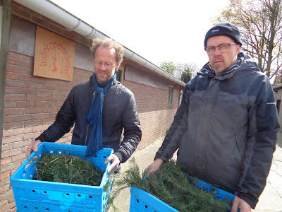 Om 10 uur ´s ochtends stonden de eerste bezoekers al bij ons op het erf om een kijkje te nemen in de destilleerwerkplaats. Eén van hen heeft nog geholpen bij het hakselen van vers geoogste Douglasspar uit het nabij gelegen Chaamse bos.