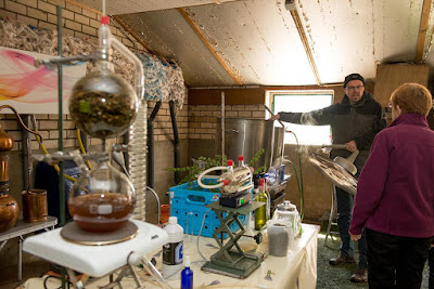 Henks plan was namelijk om tijdens de inloopdag Douglasspar te gaan destilleren in de 150 liter destilleerketel. Vanwege de lage temperaturen heeft Henk daar vanaf gezien en heeft hij gebruik gemaakt van een glazen destilleeropstelling met een capaciteit van 2 Liter.