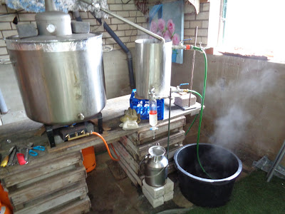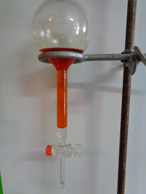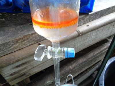 Ik wist dus eigenlijk niet wat ik zou moeten verwachten. Voor het opvangen van het stoomdestillaat heb ik gebruik gemaakt van een scheitrechter. Nog voor het eerste destillaat overkwam vulde de destilleerwerkplaats zich met een zwaar kruidige lucht.