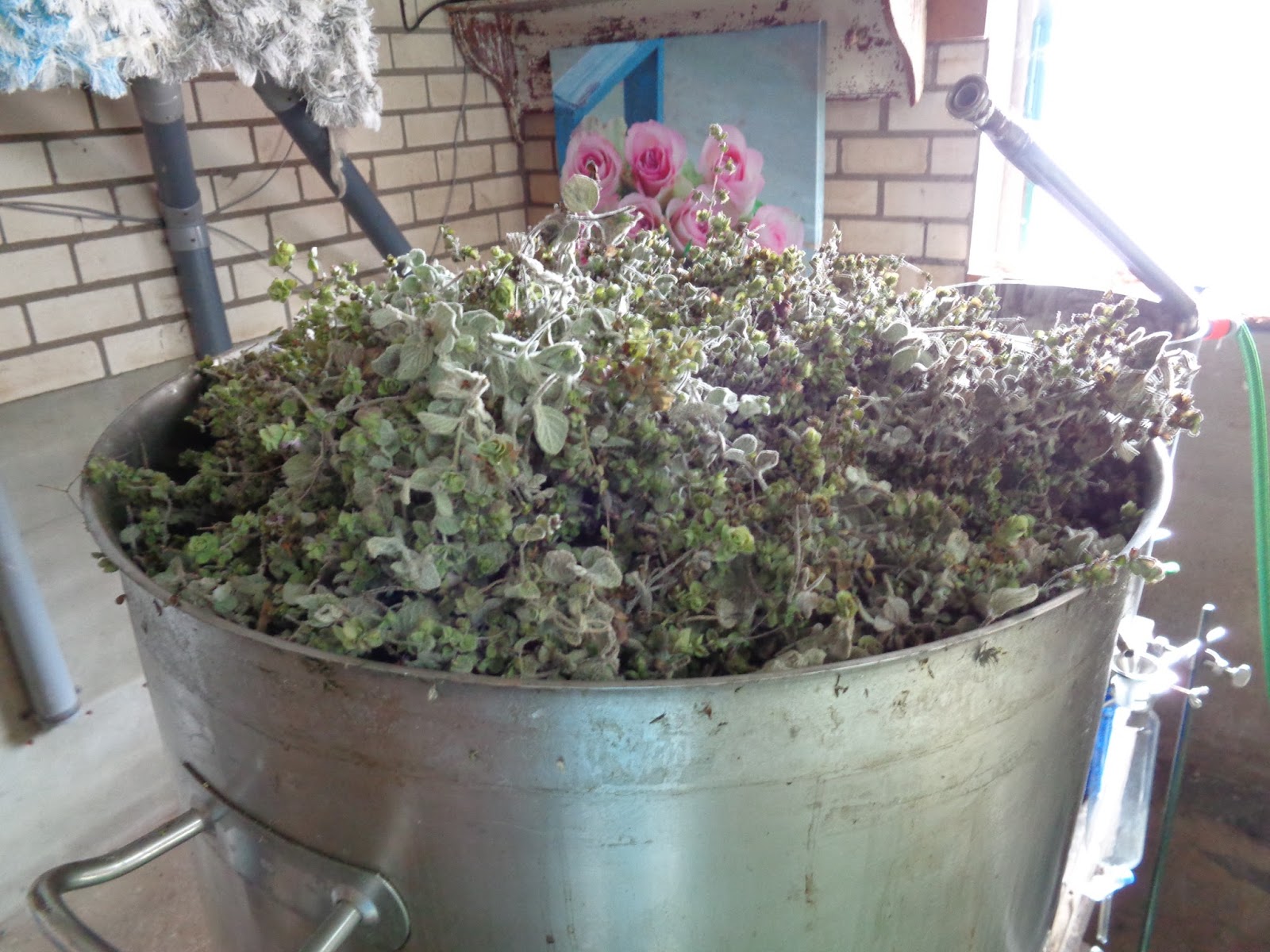 Na een dag ruik je geen aromatische stoffen meer, maar alleen de lucht van drogende planten. Over een aantal dagen ga ik de tijm en Kreta oregano apart destilleren.