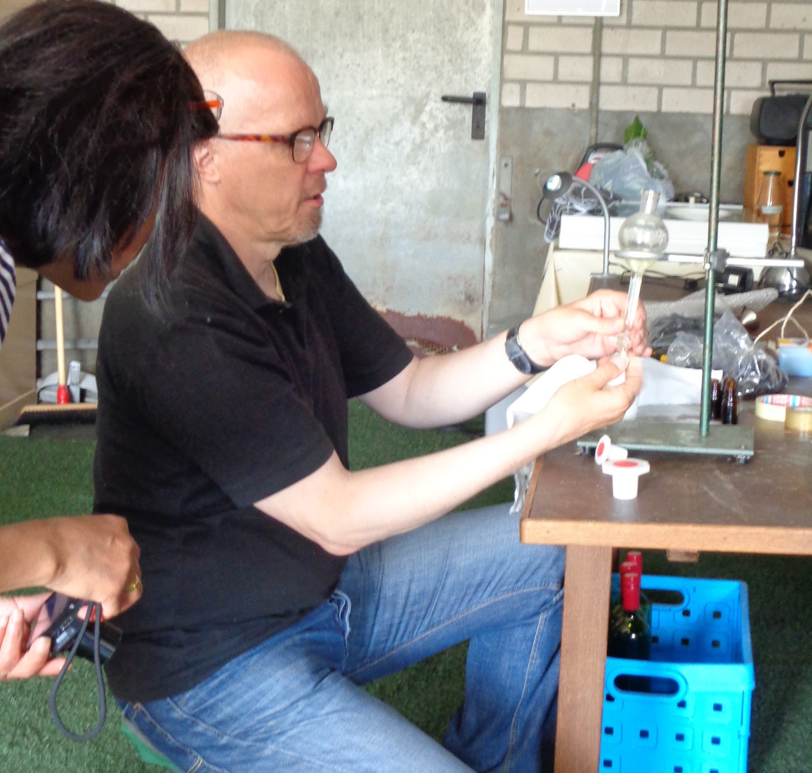 Tijdens de destillatie heb ik gebruik gemaakt van een scheitrechter ( 500 mL) om de etherische olie van het hydrolaat te scheiden. Daardoor moet je wel alert blijven om de scheitrechter regelmatig af te tappen. Gelukkig had ik meewerkers die het proces nauwlettend in de gaten hielden!