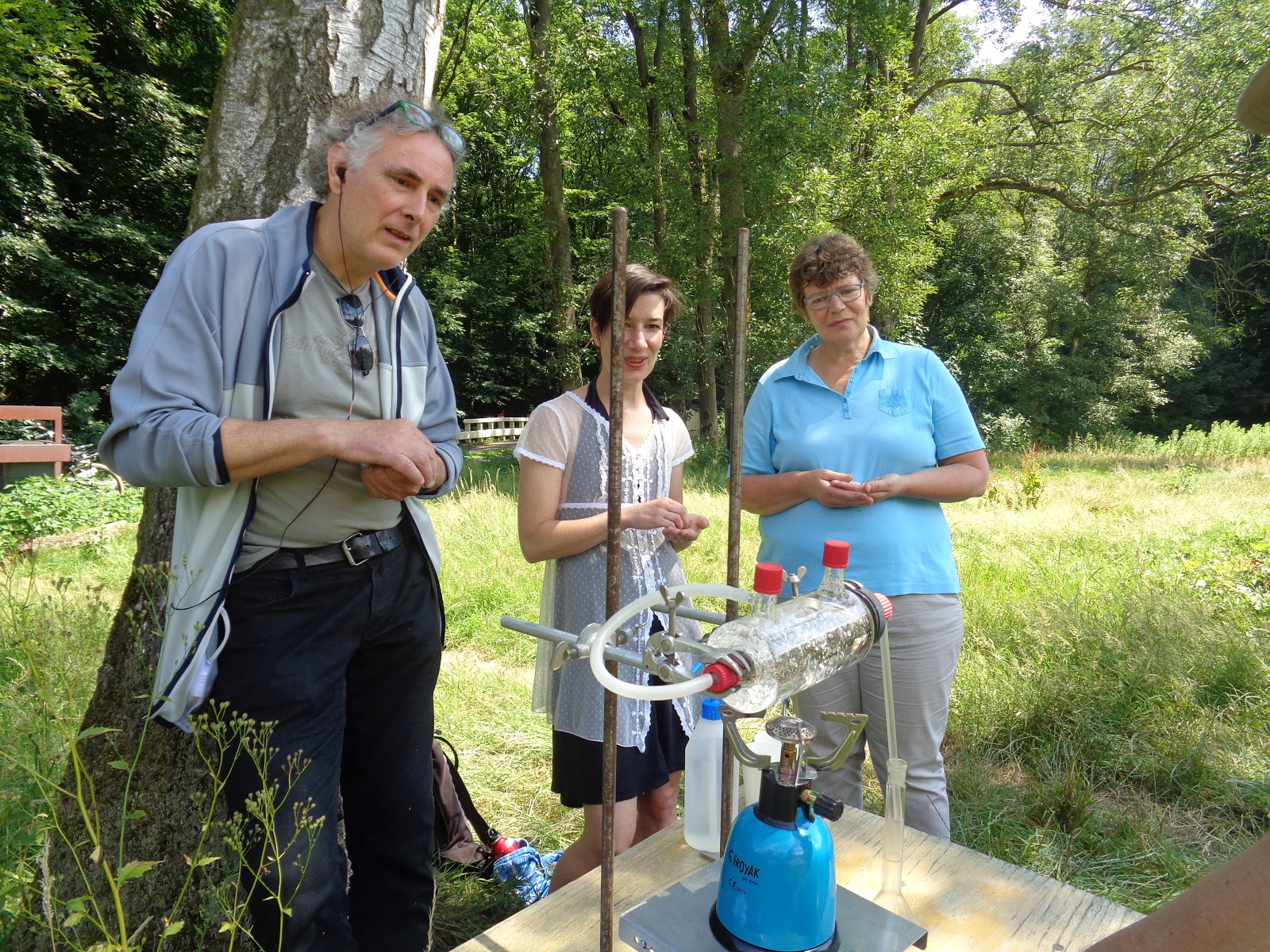 Om een workshop te geven waarbij ook de techniek van het stoomdestilleren zichtbaar werd gemaakt heb ik mijn kleinste destilleerapparaat meegenomen. Met dit apparaat is het mogelijk om 100 mL kruiden te destilleren. Ik heb gedroogde Lavandinbloemen gebruikt waarmee het mogelijk is om na de destillatie een klein beetje etherische olie zichtbaar te maken. De geur is geen probleem, omdat ik geen koeler gebruikt heb en er zodoende veel stoom en aromatische stoffen konden ontsnappen.
