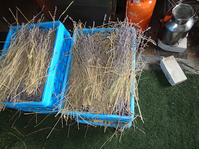 Van twee workshopdeelnemers kreeg ik het aanbod om een aantal zakken gedroogde lavendel op te halen. Deze lavendelboeketten waren nog afkomstig van lavendelboerderij Viva Lavandula waar ik in 2010 lavandin had geplukt. Het was dus uit Nederland afkomstige lavendel. Ik was eigenlijk ook wel benieuwd hoeveel lavendelolie je nog uit droogboeketten kunt halen.