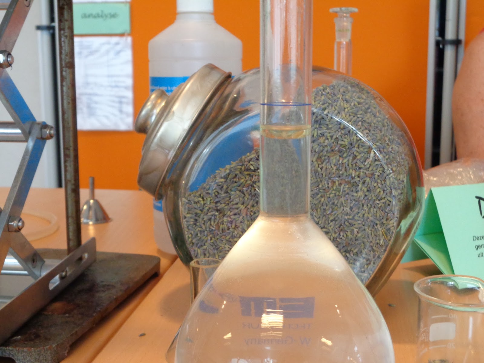 Voor een doorlopende demonstratie had ik gekozen voor een kleine glazen stoomdestillator met een capaciteit van 100 mL om gedroogde lavandinbloemen te destilleren. Deze gebruik ik vaker bij demonstraties omdat het destillatie-proces goed te volgen is.