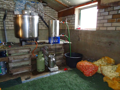 De ketel was al bijna op stoom toen de tulpen in de destilleerwerkplaats werden binnengedragen, dus het duurde niet lang voordat het eerste destillaat uit de koelemmer kwam druppelen.