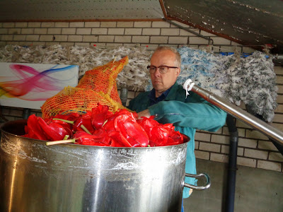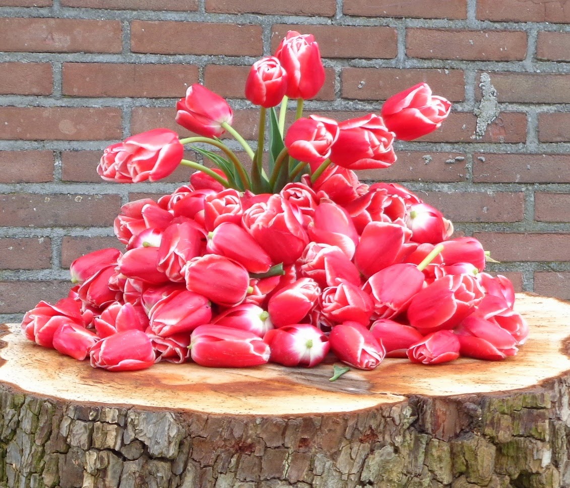 Met deze wetenschap had ik de workshopdeelneemster gevraagd om voor plm 15 kg versgekopte tulpen te zorgen. De onbespoten gekweekte tulpen heeft ze op de ochtend van de workshop gehaald uit Sint Maartens- vlotbrug een plaatsje in de kop van Noord-Holland. Ze had in totaal ongeveer 30 Kg rode en witte tulpen meegenomen.